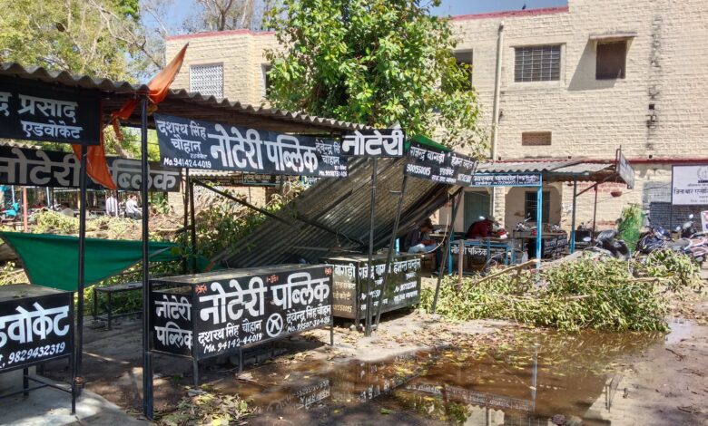 अभी मौसम विभाग के अलर्ट क़ो देखते हुए आज सम्पूर्ण राजस्थान मै भारी बरसात के अलर्ट मै राजस्थान के करीब सभी जगह बरसात ने अचानक धावा बोला, ब्यावर शहर मै बरसात के अचानक धावा बोला जिसमे आधी तूफान के साथ पानी वाली बरसात नहीं होकर सीधे ओले गिरे वो भी अचानक ताबड़तोड़ ओले, की लोगों क़ो सम्भलने का मौका भी नहीं दिया, शहर मै कई जगह बिजली के पोल तक टूट कर दिए, कई जगह पेड गिरे, कहीं किसी ई रिक्शा पर पेड गिरा तो कहीं दुकानों के छपर उड़ गए, इसको देखते हुए, ब्यावर शहर सैशन कोर्ट मै जहाँ वकील बैठते है वहां अचानक से एक बड़ा पेड जो की वकीलों की बैठक के पीछे थे वह विशालकाय पेड टूट कर वकीलों की मेज पर गिरा, जिससे कोइ जन धन हानि तो नहीं हुई और वकील साहब के ऊपर लगाए टीन भी उड़ गए टूट गए। और कोर्ट मै कई जगह जहाँ वकील बैठते है वहां चलते हुए पंखे भी टूट गए।