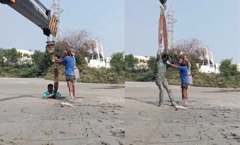 किशनगढ़ में मार्बल स्लरी के दलदल में फंसा युवक, क्रेन से सुरक्षित निकाला गया